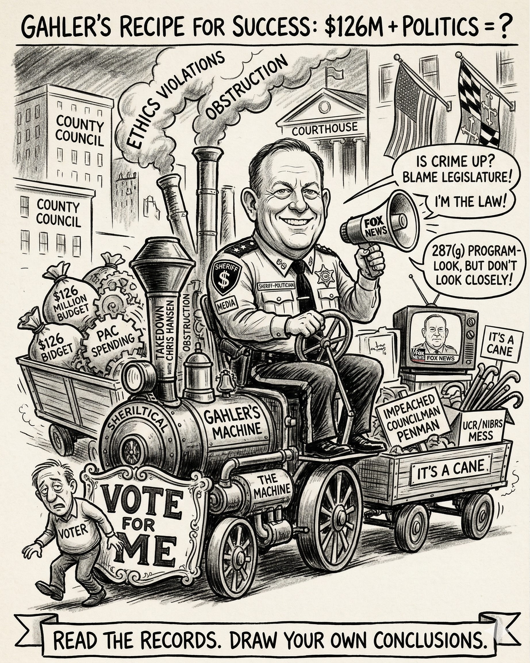 A $126 million budget. A deputy on the council voting on that budget while drawing $200,000 in combined salaries. An ethics board finding three violations. The Supreme Court of Maryland removing that deputy. A campaign manager hired from a convicted politician’s staff, working the government job and the campaign at the same time. A state investigation obstructed. A court order to comply within 24 hours. An unarmed man dead from a shotgun fired by a sergeant who identified the object as a cane. A $1 million settlement compared to Freddie Gray. Crime up 20% and the legislature blamed. Sixty-two percent of arrests for low-level offenses — higher than 70% of departments nationwide. An immigration program that screened 2,919 people and produced 43 detainers. A 75% non-deportation rate. More than 40% of ICE transfers happening before trial. Inflated program numbers. Arrests branded for a streaming show. A Fox News contributor credential on a sheriff’s campaign website. A union PAC spending six figures per cycle to install political allies. And a fourth term filing after twelve years with no serious opposition.