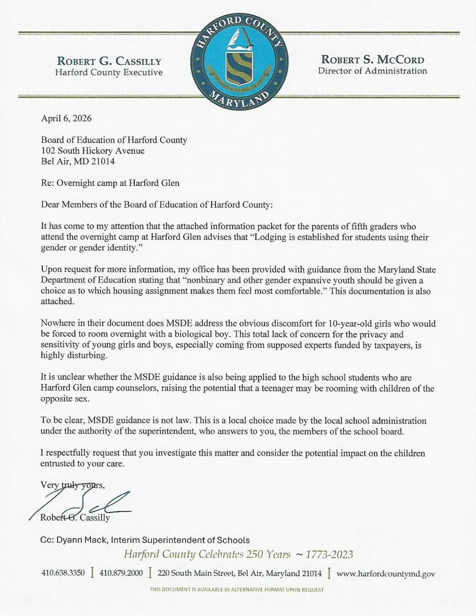Cassilly’s legal argument is solid. The MSDE guidance behind the Harford Glen policy is not law. It’s a suggestion. HCPS was never required to adopt it. They chose to, under a superintendent who’s now gone. The Title IX coordinator who would have managed compliance is on leave. Nobody was minding this.